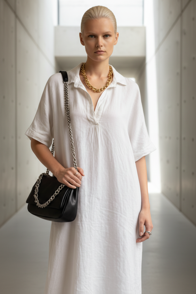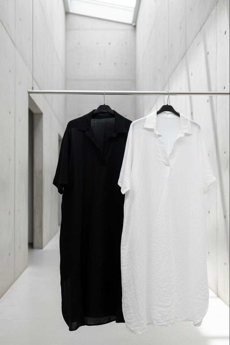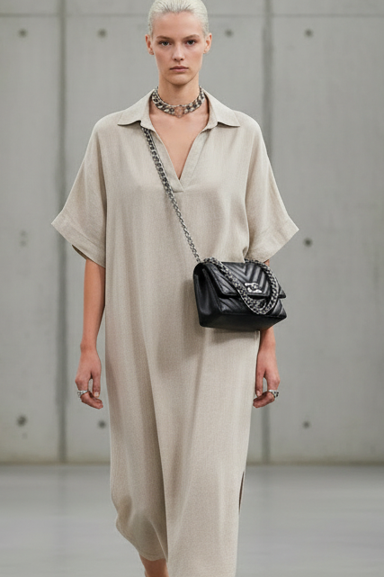 שמלת פשתן בגזרת אוברסייז משוחררת, עשויה בד טבעי, קליל ונושם שמעניק תחושת רכות ונוחות לאורך כל היום.