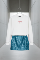 חצאית פאייטים קצרה ונוצצת בגזרת מיני מחמיאה, עם הברקה עדינה שמייצרת לוק אלגנטי ונועז.