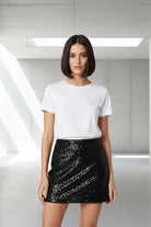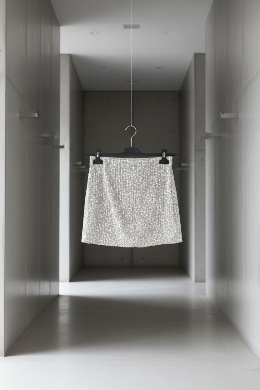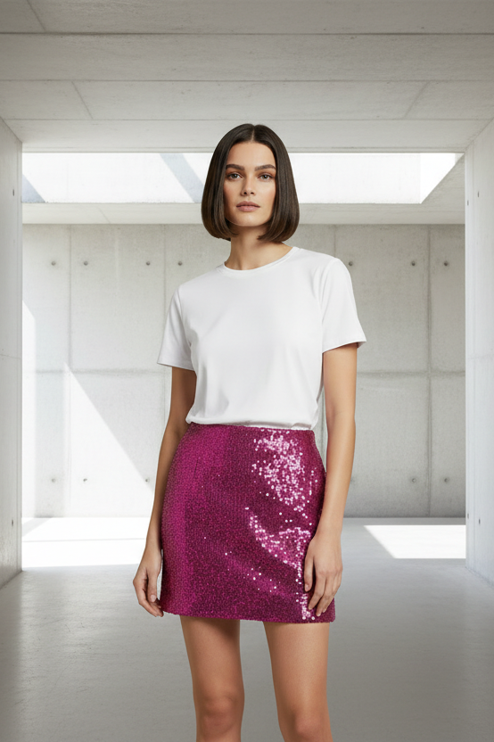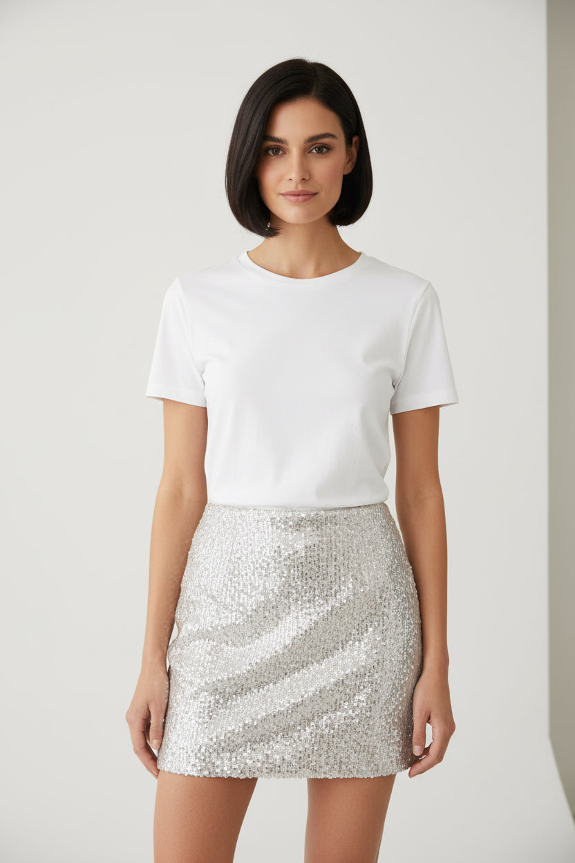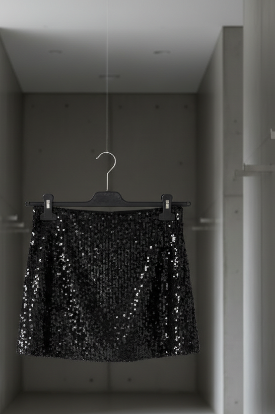 חצאית פאייטים קצרה ונוצצת בגזרת מיני מחמיאה, עם הברקה עדינה שמייצרת לוק אלגנטי ונועז.