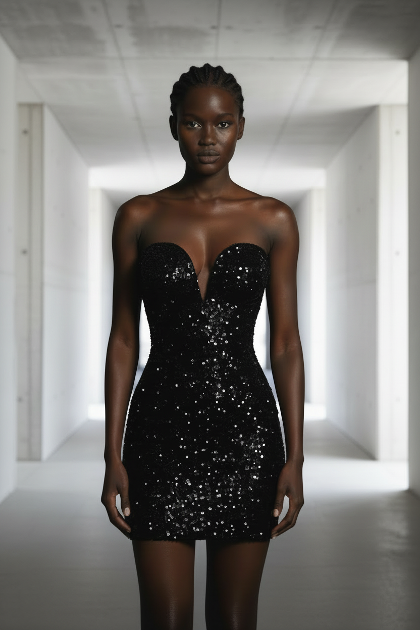 שמלת ערב קצרה וסופר־זוהרת בגזרת סטרפלס מחמיאה במיוחד.