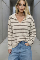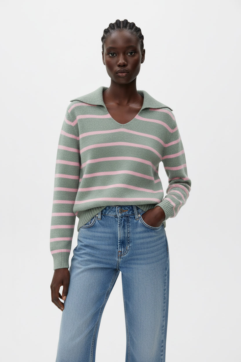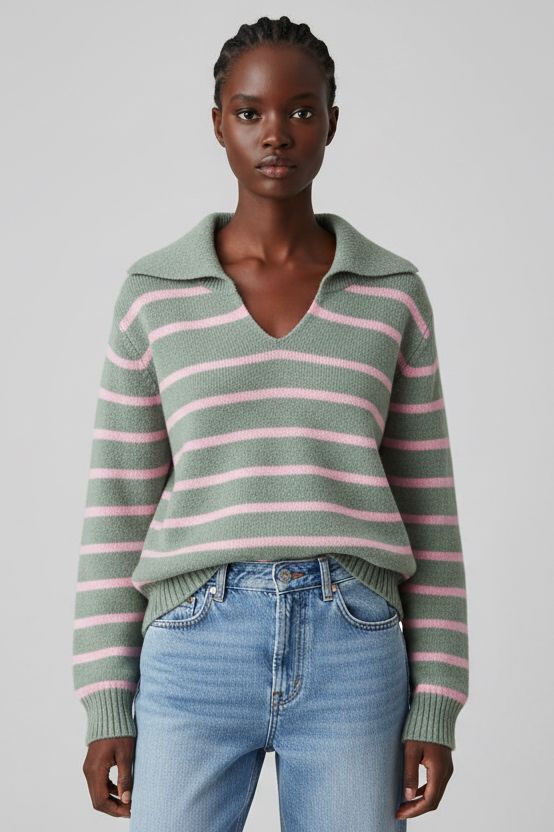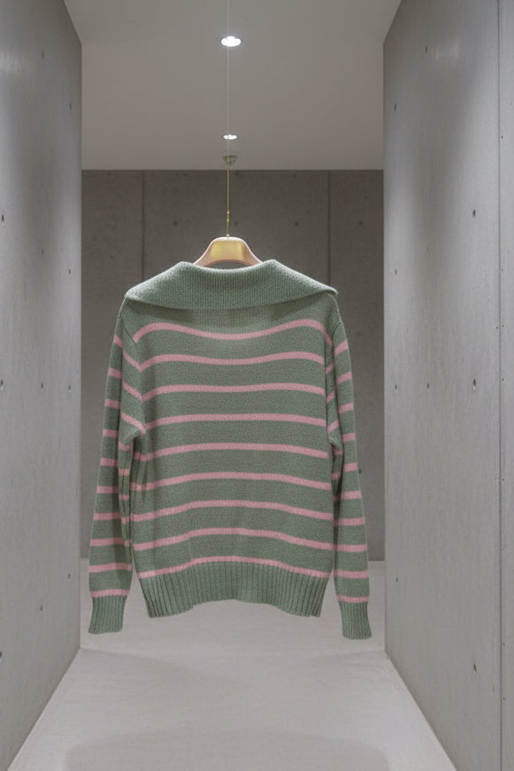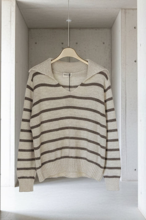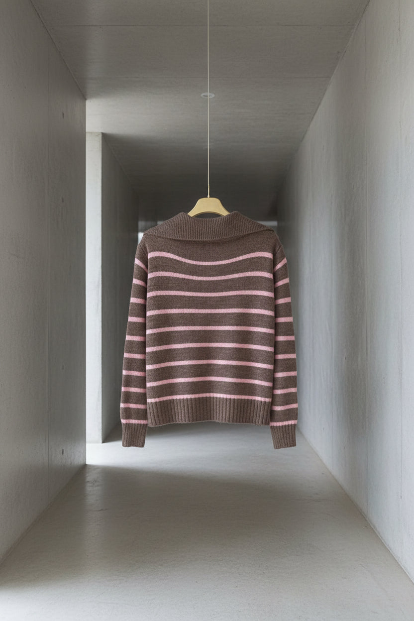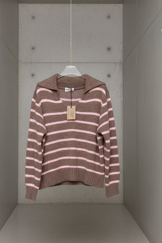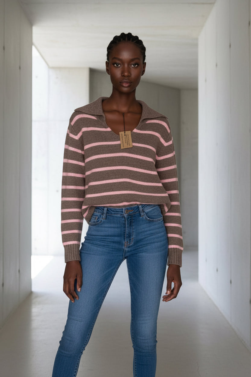 סריג אוברסייז מפנק ורך בניחוח אביבי קלאסי, עם דוגמת פסים עדינה וגזרה רחבה שנופלת מושלם על הגוף.