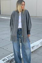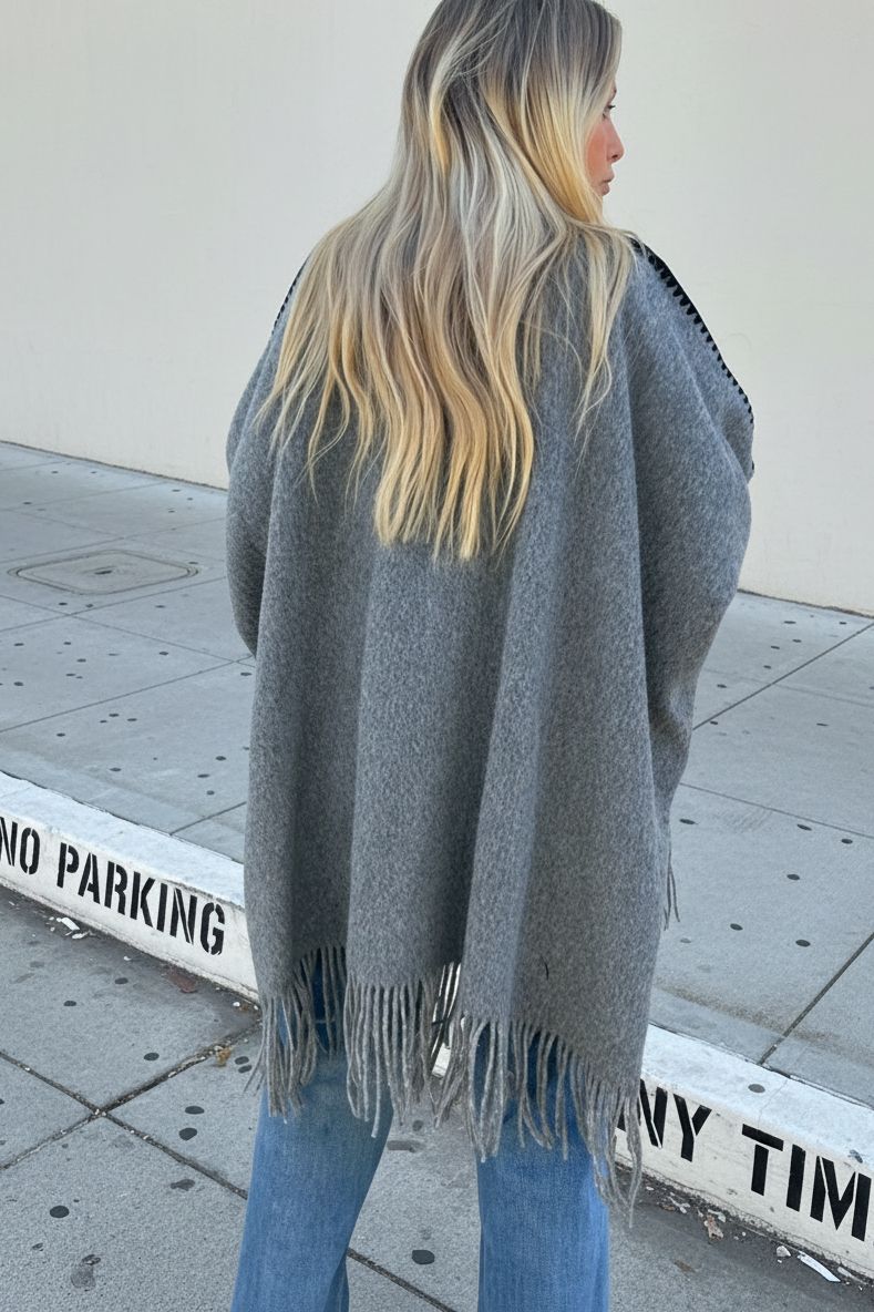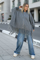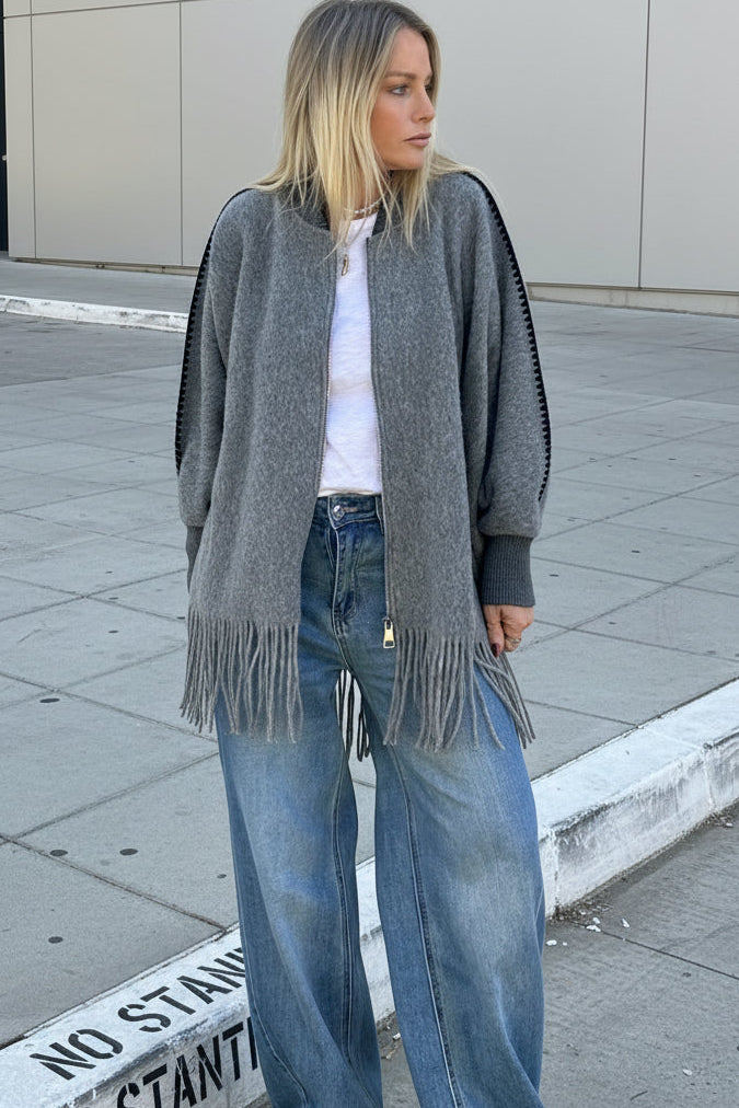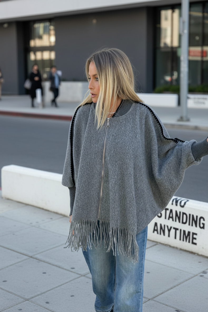 ג׳קט־פונצ׳ו רך ומפנק בגזרה אוברסייז, עם סגירת רוכסן קדמית ושוליים מעוטרים בפרנזים לסטייטמנט שיקי ולא מתאמץ.