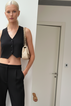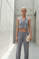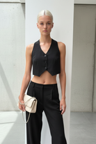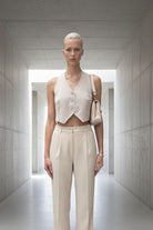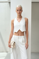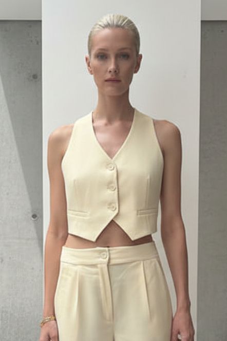 ווסט בגזרה מחויטת עם מפתח עמוק וגב פתוח ליצירת לוק אלגנטי ונשי עם טוויסט מודרני.
