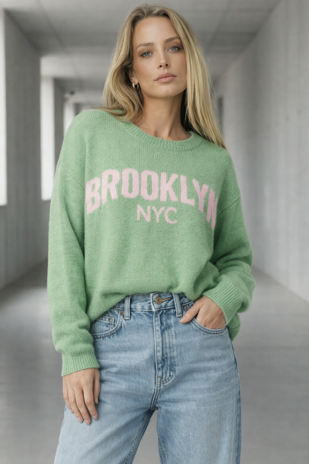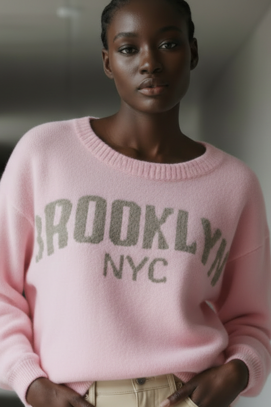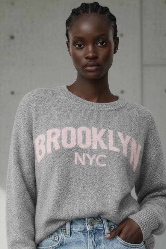 סריג רך ונעים בגזרה נינוחה, עם כיתוב BROOKLYN NYC בחזית למראה אורבני וקליל.