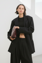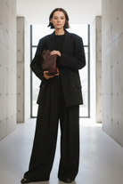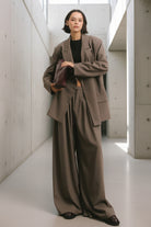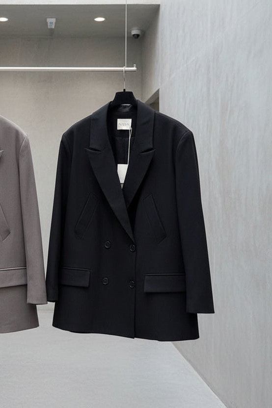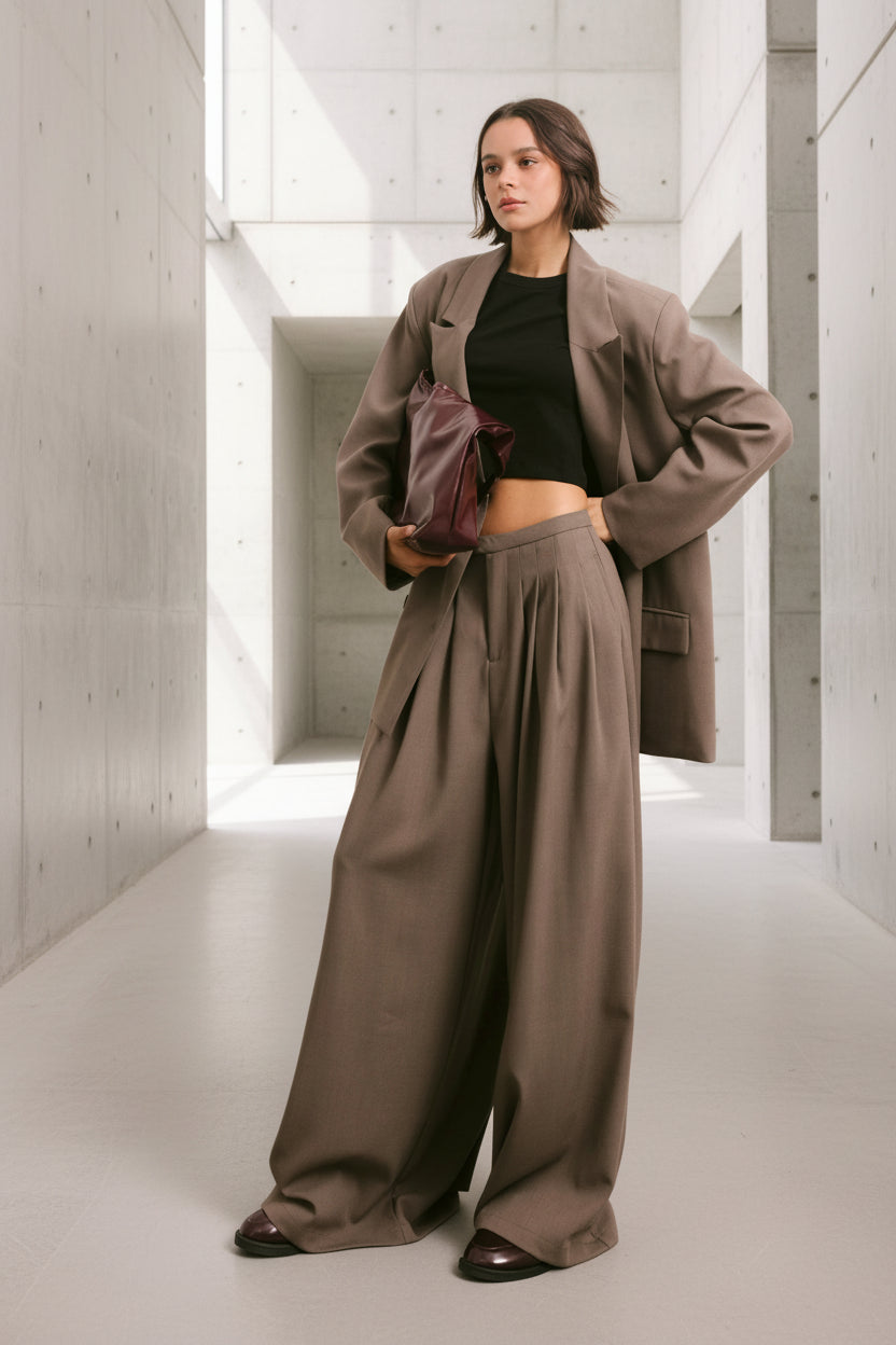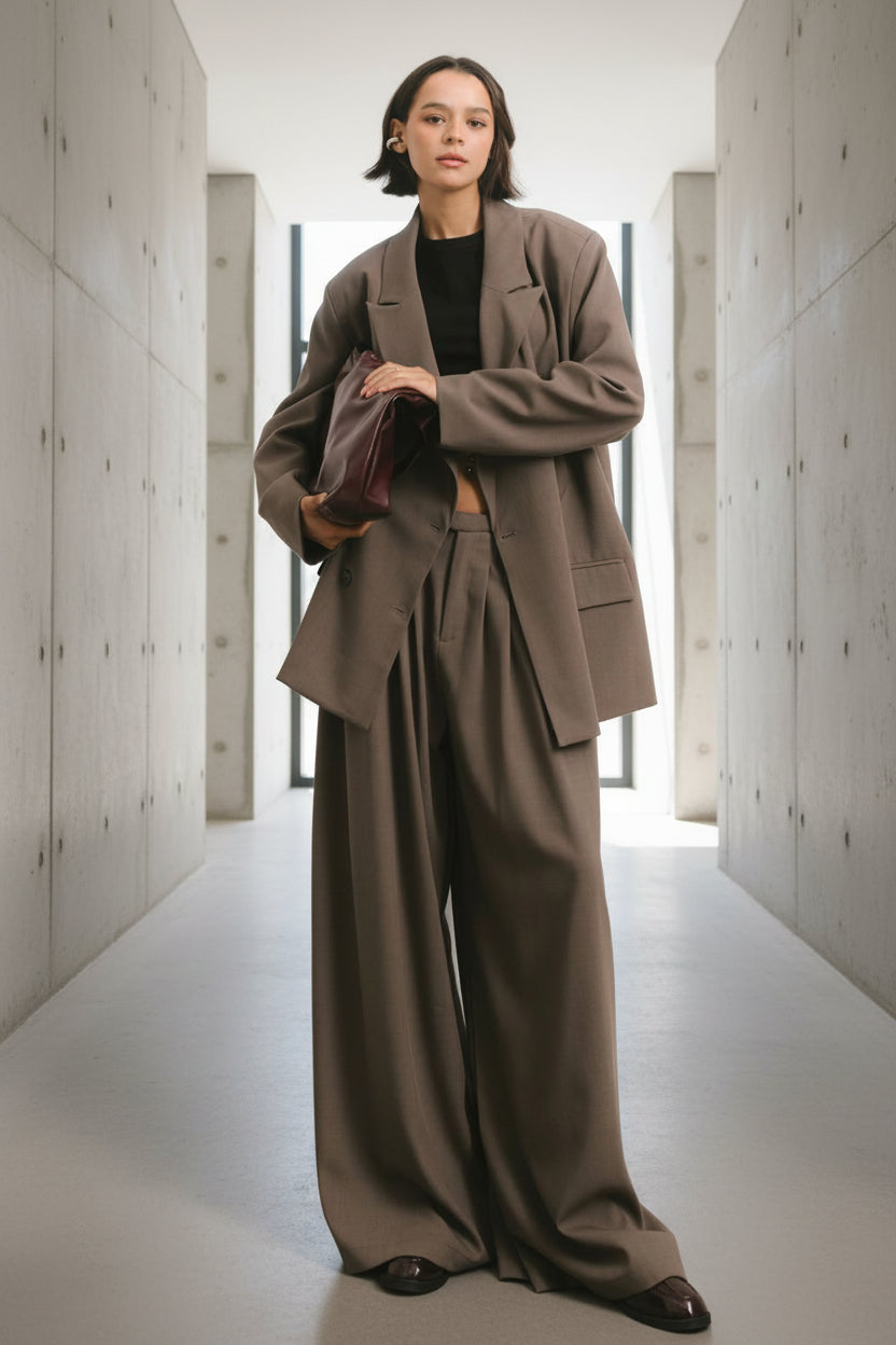 גזרה רחבה ונשפכת עם כתפיים מודגשות שיוצרות לוק עוצמתי ומדויק.