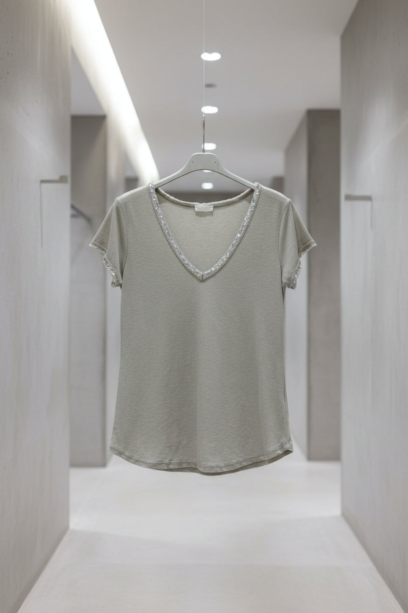 גזרת V נשית ומחמיאה עם פרומים עדינים במפתח ובשרוולים, למראה עדכני ומעט בוהו.