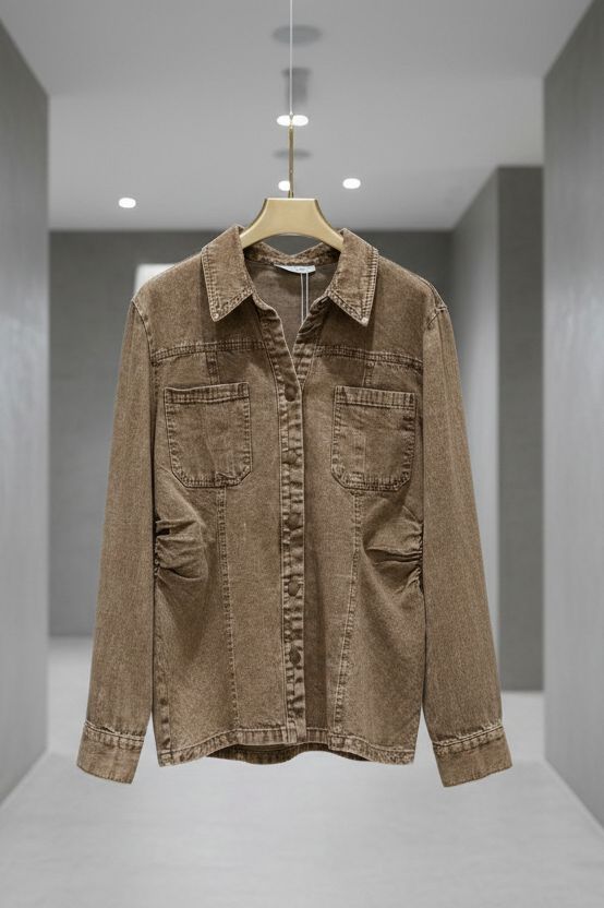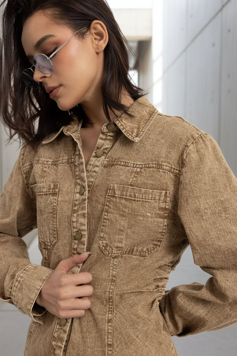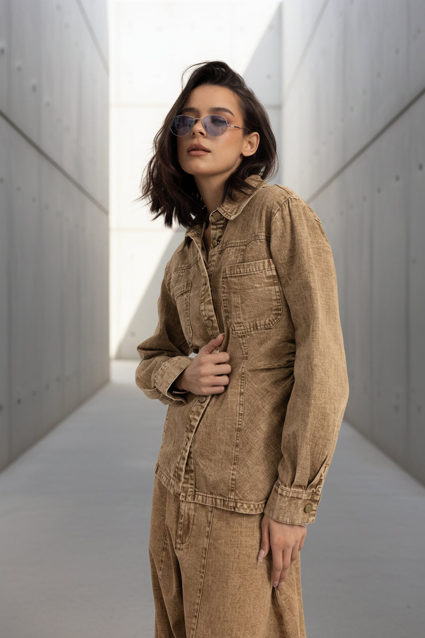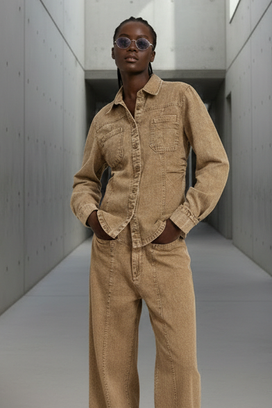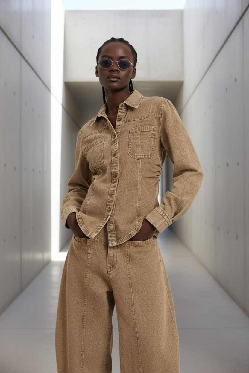 חליפה מבד ג’ינס צבוע בגוון חם וייחודי, הכוללת חולצה מכופתרת ומכנס תואם בגזרה מחמיאה.