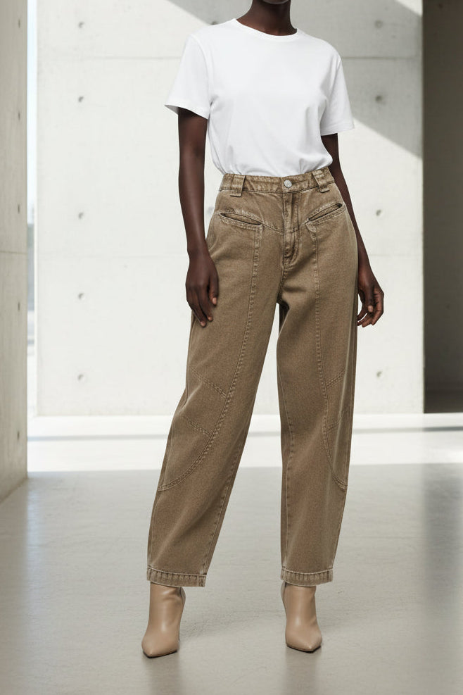 המכנס בגזרה ישרה עם קריצה לגזרת בלון עדינה והצרה קלה בקרסול, יושב גבוה על המותן ומדגיש את הסילואטה.