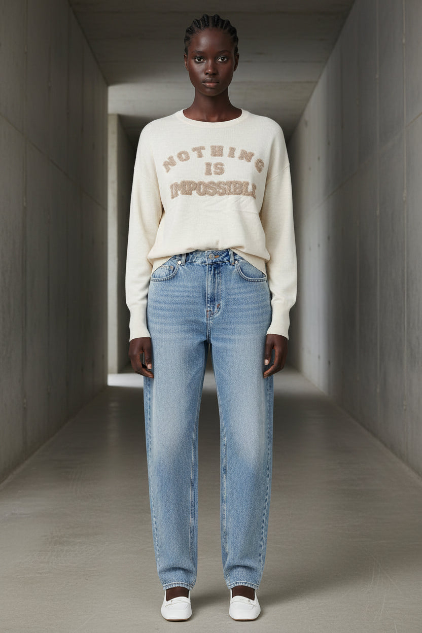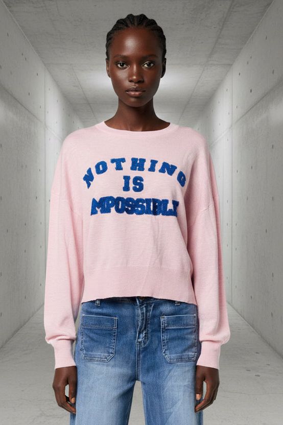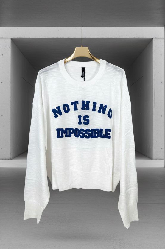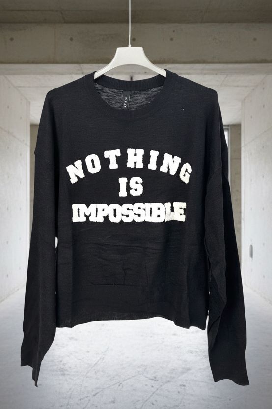סריג דקיק, רך וקליל עם הדפס בולט “Nothing Is Impossible” בטקסטורת בוקלה שמוסיפה עומק ונוכחות.