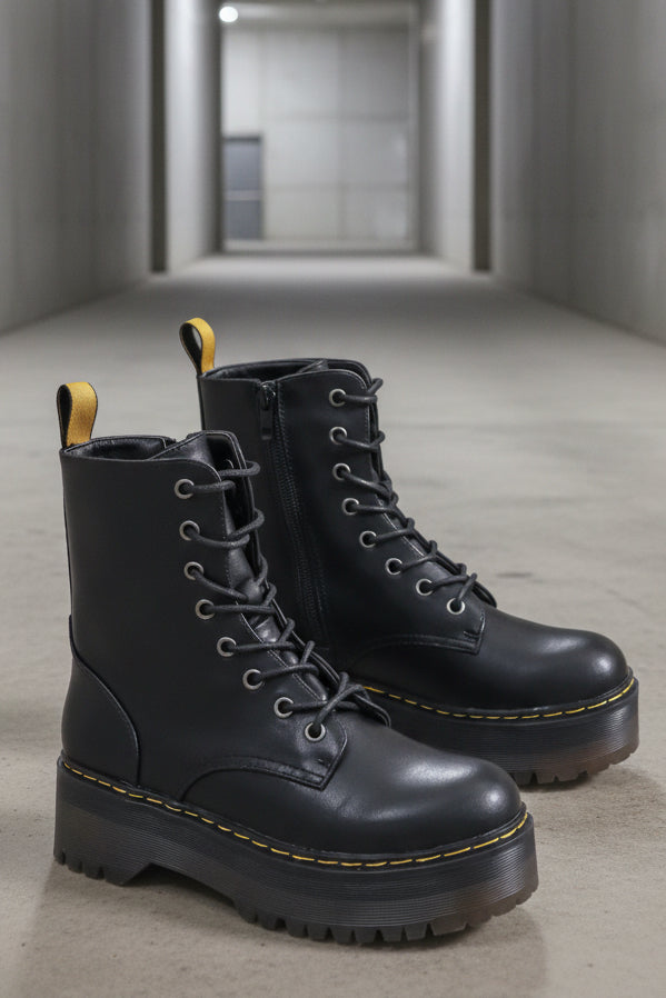 מגפי קומבט שחורים בגזרה קלאסית עם סוליית פלטפורמה עבה ומודגשת.