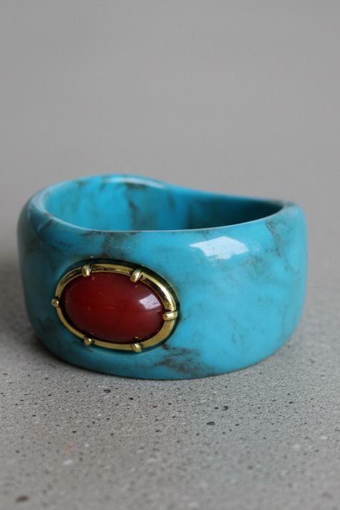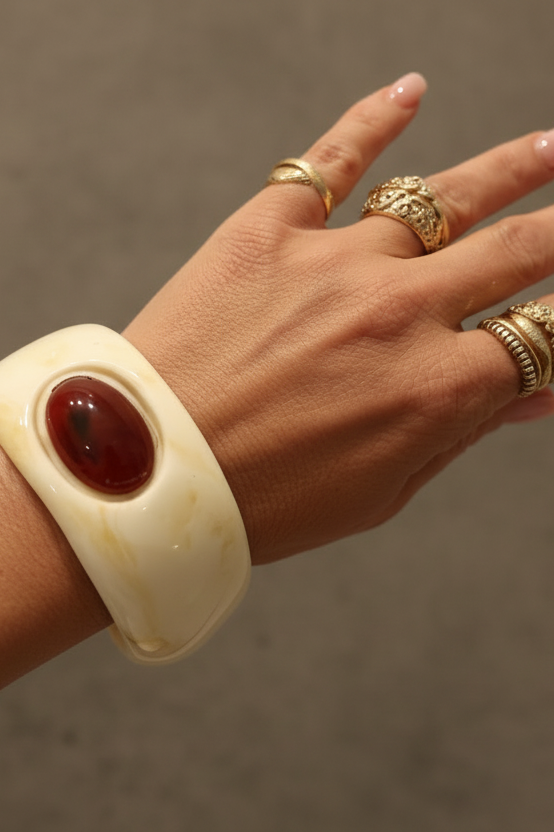 צמיד קשיח בסגנון וינטג’ עם נוכחות, מעוצב בגזרה רחבה ומעגלת ובמרכזו אבן מודגשת בגוון עמוק ומבריק.